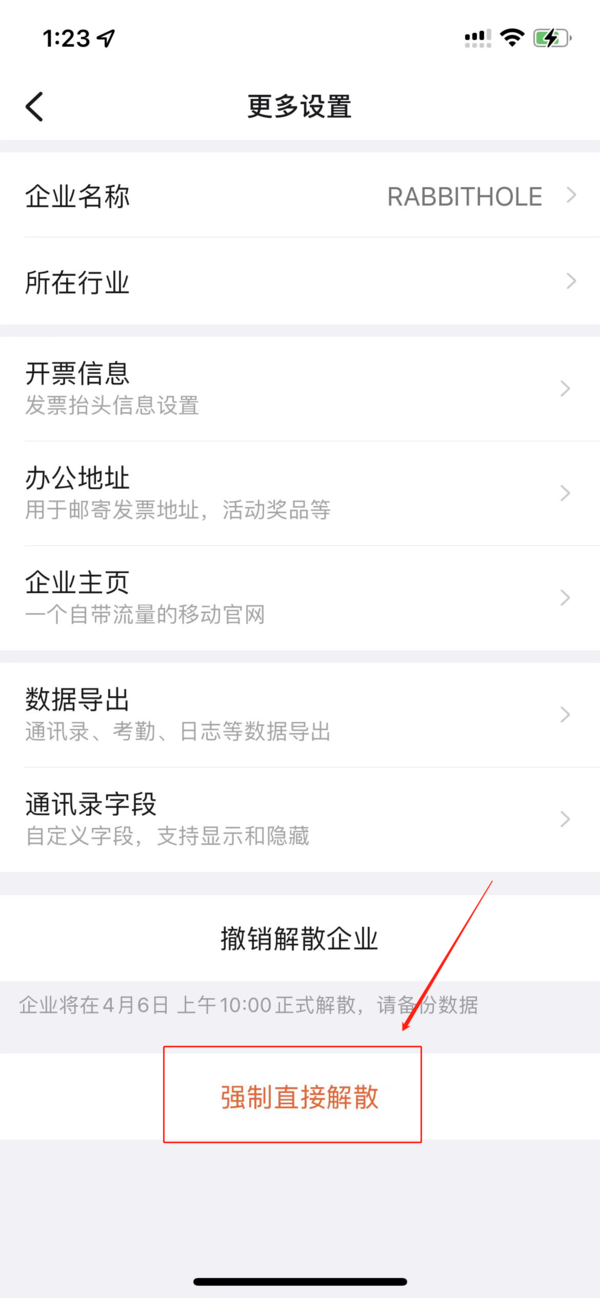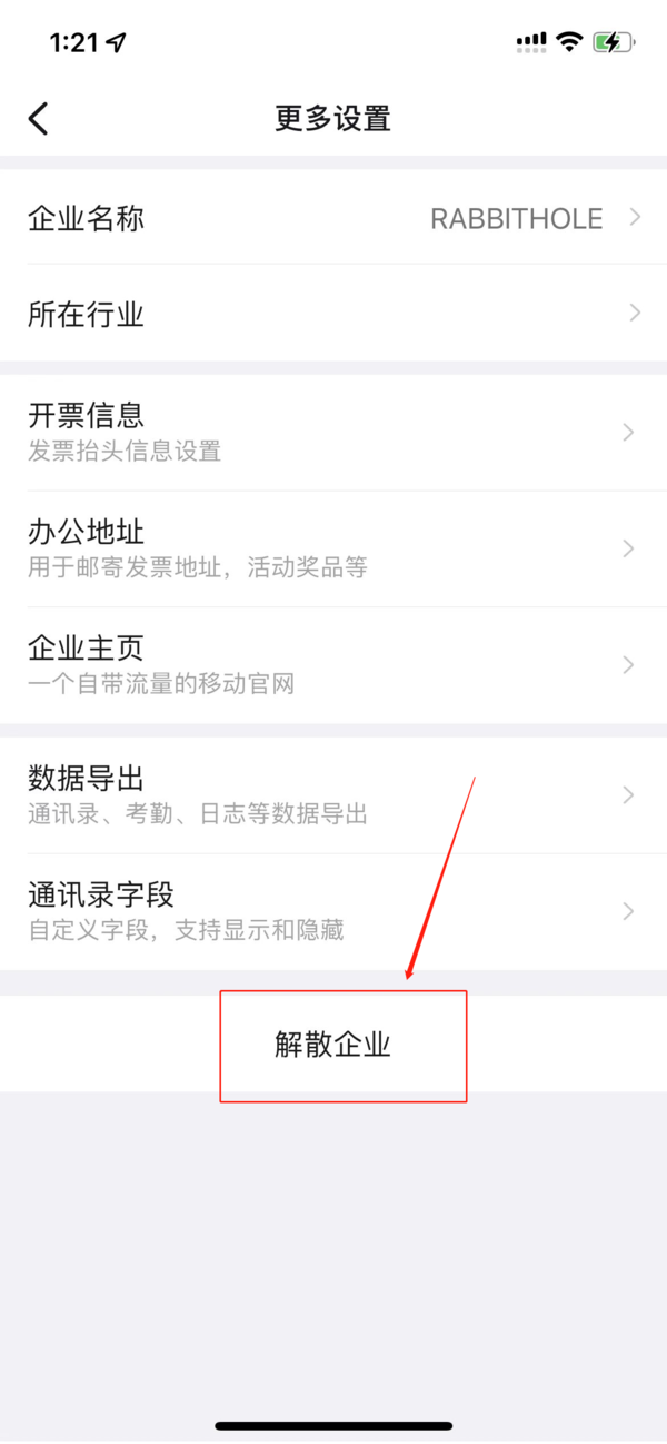 3、这时会出现“更多设置”界面,在这个界面的最下方有一个“解散企业”的选项,单击进入到后续步骤界面。