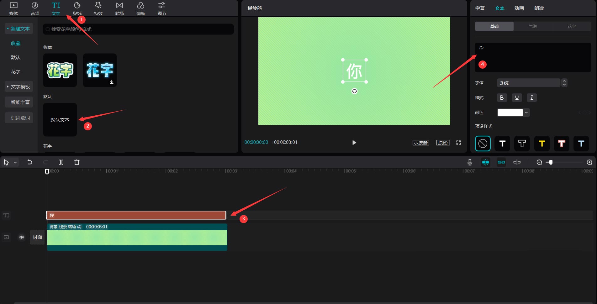 2、随后点击文字菜单,选择默认文本,将其添加到文字轨道上。