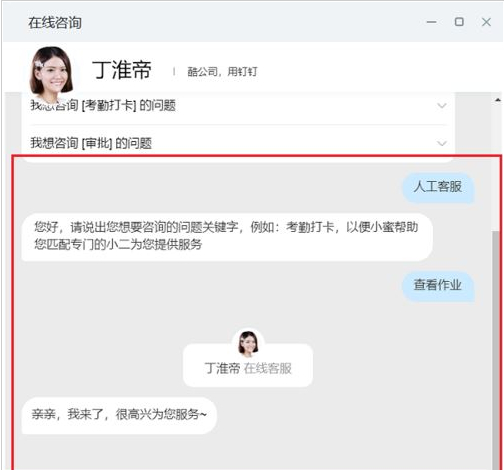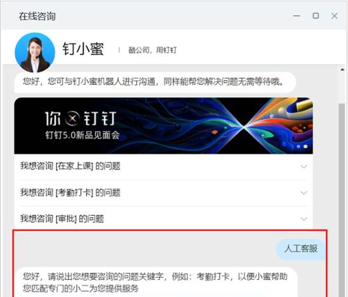 第四步进去钉小蜜之后,输入人工客服,如下图所示: