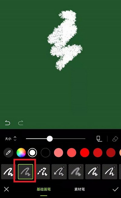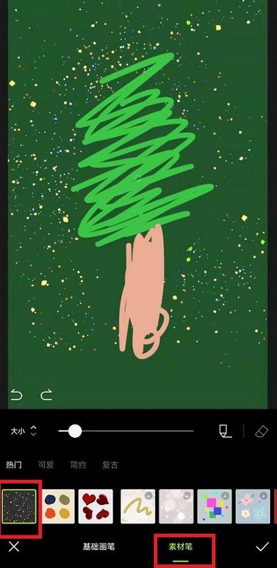 4、然后在涂鸦功能中,我们就可以参考网上的圣诞树图片去进行创作,利用不同的颜色和画笔可以画出圣诞树的树干。