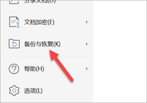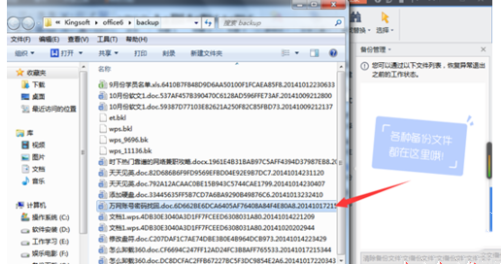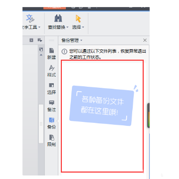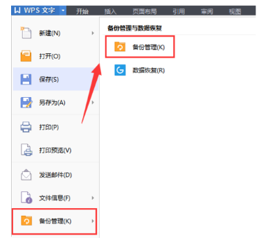 2、点击打开,wps菜单选项,如下图找到”备份管理“---”备份管理“功能。