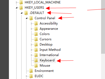 3、然后依次打开:[HKEY_USERS\.DEFAULT\Control Panel\Keyboard]。