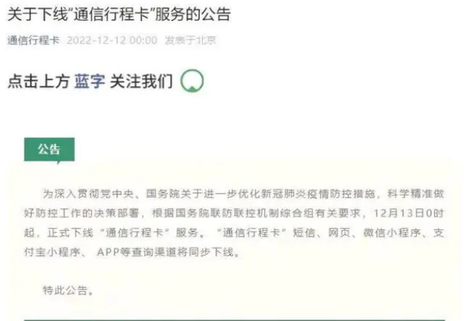 根据国务院联防联控机制综合组有关要求,12月13日0时起,正式下线“通信行程卡”服务。“通信行程卡”短信、网页、微信小程序、支付宝小程序、 APP等查询渠道将同步下线。