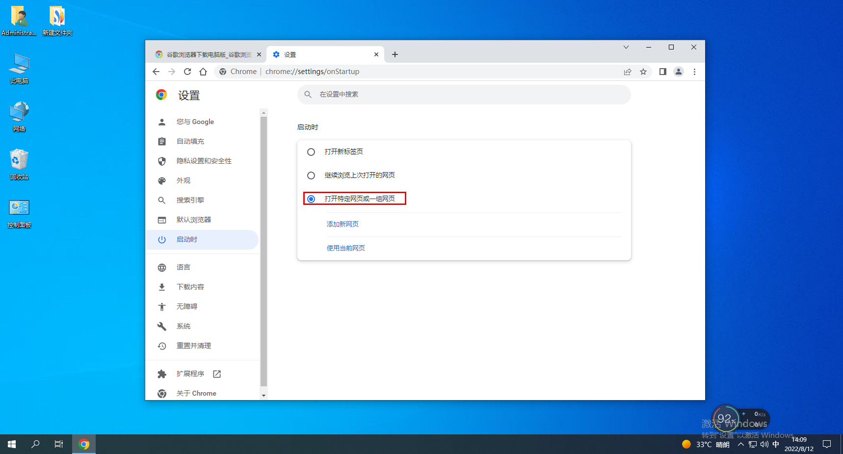 2、在启动时下方选择打开新标签页或者点击打开特定网页或一组网页,手动设置主页。