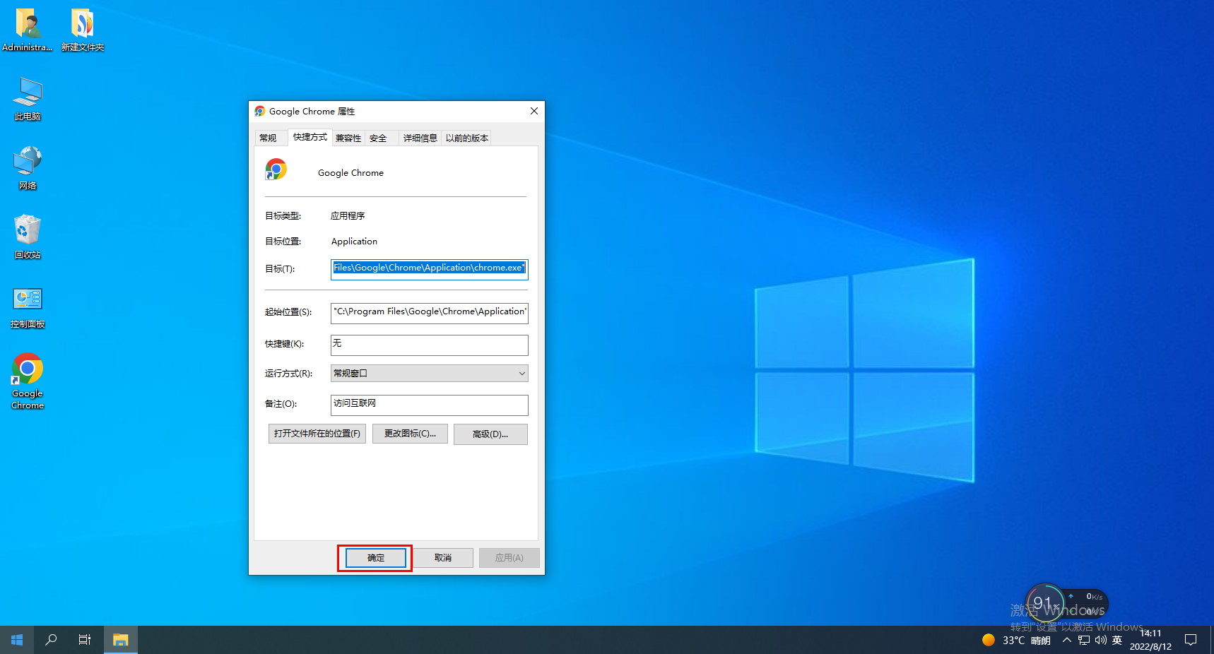 4、在快捷方式的目标中,检查chrome.exe文件路径,如果路径最后有网址,删除网址点击应用和确定即可。