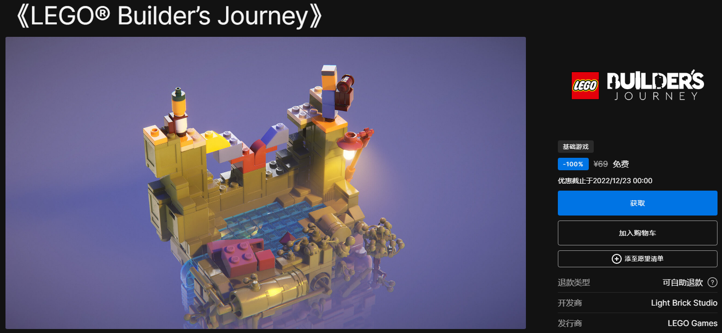 答:epic2022年12月22日的免费游戏是《LEGO® Builder's Journey》。