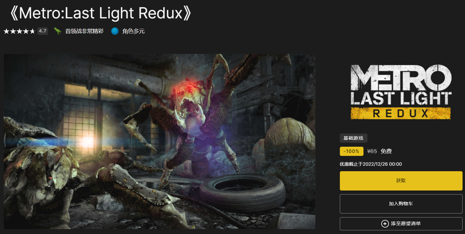 答:epic2022年12月25日的免费游戏是《Metro:Last Light Redux》。