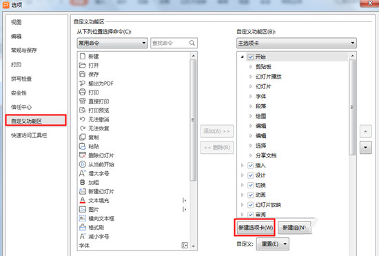 2、在弹出PPT选项窗口,选择【自定义功能区】——【新建选项卡】;