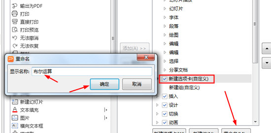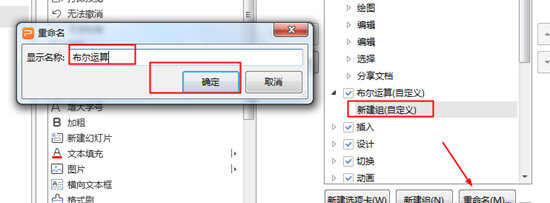 3、点击【新建选项卡(自定义)】,弹出重命名对话框,右击输入【布尔运算】,点击确定;