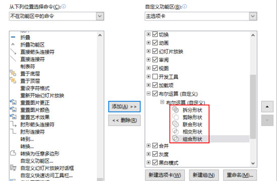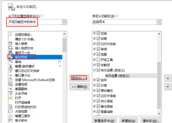 5、点选新建组的布尔运算,在左边下拉菜单中选择【不在功能区中的命令】,滑动选择【拆分形状】,点击【添加】;