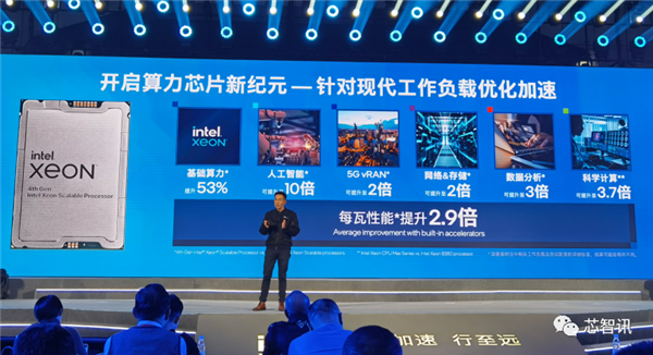 根据Intel官方公布的数据显示,与前一代处理器相比,第四代Intel至强处理器的基础算力提升了53%,人工智能性能提升10倍,5G vRAN性能提升了2倍,网络&存储性能提升了2倍,数据分析性能提升了3倍,科学计算性能提升了3.7倍。