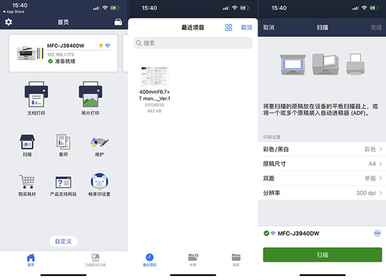 在今天,办公室里设备远不止电脑那么简单,智能手机、平板电脑都纷纷进入生产环境当中,对打印机、一体机连接方式要求,这对于A3幅面机型尤甚。对此兄弟MFC-J3940DW,不仅提供了常见的网线、USB连线打印,U盘直读打印,在手机APP和微信上也花了不少功夫,提供了Brother Mobile Connect App与兄弟畅享印微信小程序两个适合移动终端的工具。
