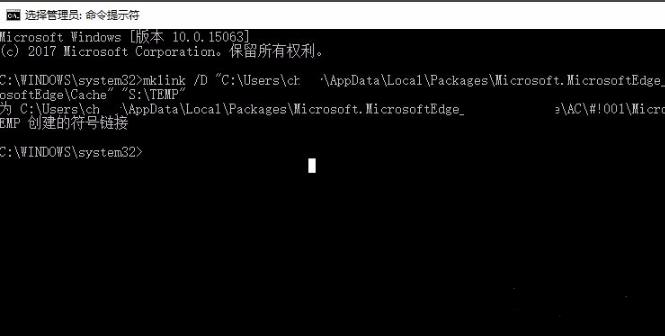 mklink /D “C:\Users\用户名\AppData\Local\Packages\Microsoft.MicrosoftEdge_8\AC\#!001\MicrosoftEdge\Cache” “S:\TEMP”