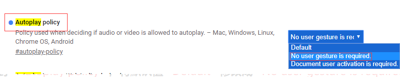 3、然后找到 “Autoplay policy” ,将默认值 “Default” 修改成 “No user gesture is required”选项。