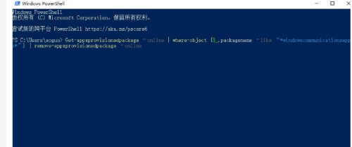 4、在窗口输入Get-appxprovisionedpackage –online | where-object {$_.packagename –like “*windowscommunicationsapps*”} | remove-appxprovisionedpackage –online代码(如图所示)。