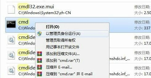 3、找到windows/system32/目录下的cmd,再右击“以管理员身份运行”。