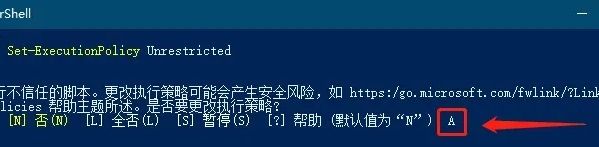 2、在其中输入“ Set-ExecutionPolicy Unrestricted ”回车运行,弹出图示提示,输入“A”回车。