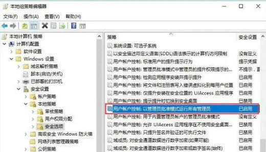 3、在右侧找到用户账户控制:以管理员批准模式运行所有管理员,双击打开,选择已禁用点击确定。
