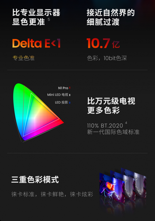 其实准确来说,“更好”也是整个坚果N系列的关键词。在去年12月,坚果就发布了N系列N1Pro、N1 Ultra两款产品。以N1 Pro为例,110% BT.2020 色域覆盖(2倍于LED光源投影)、1600:1对比度(3倍于LED光源投影)、10bit 色深、△E<1 高色准和95%均匀度,除亮度参数外,坚果N1 Pro其它的每一项画质指标都全面领先于行业。