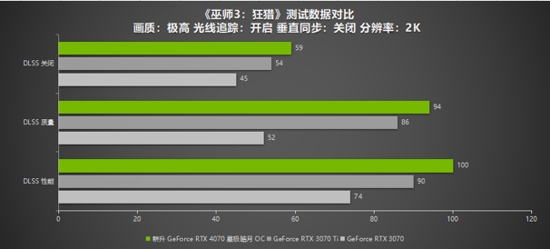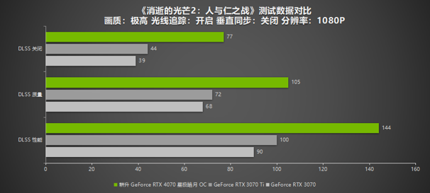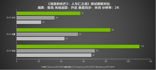 在《消逝的光芒2:人与仁之战》中,DLSS 3的优势更加明显:耕升 GeForce RTX 4070 星极皓月 OC 的DLSS 3“帧生成”模式能大幅提升游戏帧数,在1080P下,DLSS关闭时有77帧;DLSS质量模式时有105帧,DLSS性能模式时有144帧。而在2K分辨率下,性能差距更加明显:DLSS关闭时有57帧,DLSS 质量模式有84帧,DLSS性能模式有110帧。而RTX 3070与RTX 3070 Ti则仅有70帧的水平,在游戏流畅性方面还是DLSS 3 技术略胜一筹。