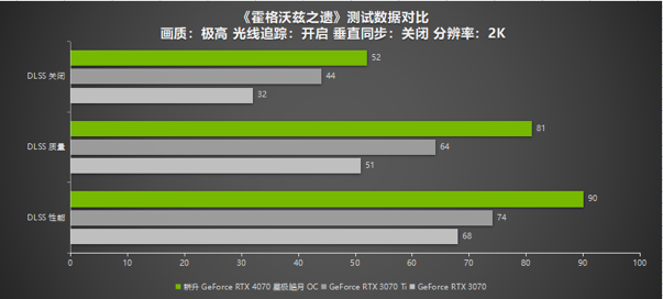 《霍格沃兹之遗》作为今年最令人瞩目的游戏且支持光线追踪及DLSS 3技术,被玩家们誉为“哈利波特”模拟器。在1080P极高画质下,耕升 GeForce RTX 4070 星极皓月 OC DLSS关闭时为76帧,DLSS 质量模式95帧,DLSS 性能模式100帧。而RTX 3070 Ti与RTX 3070都只有80帧上下;在2K 分辨率下,DLSS 3技术能为游戏带来大幅帧数提升,在DLSS 3质量模式和性能模式下,耕升 GeForce RTX 4070 星极皓月 OC 都能达到90帧左右,对于该游戏来说这个帧数能完美流畅运行。