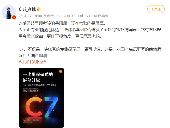 小米官方今日发文预热小米 13 Ultra,表示新机将搭载小米与华星联合研发的全新2K超清屏——C7。这款显示屏相较三星E6显示屏,拥有更高发光效率,更佳可视角度以及更低屏幕功耗。据本站了解,C7将是国产高端屏幕的绝地反超。