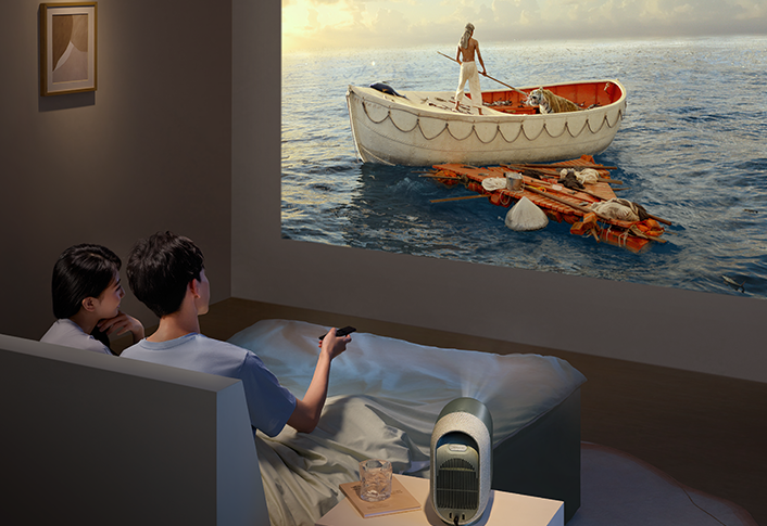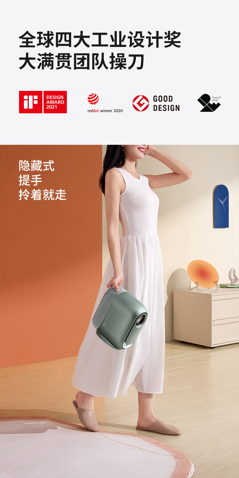 拒绝刻板的工程味的投影外观,是快乐星球作为弄潮者在兼顾好用的同时的更高追求。外观上,快乐星球O3的设计灵感来自于麦哲伦星系,与其他同类型投影仪板正的外观形状不一样的是,快乐星球O3将星环设计语言转化为了流畅的弧形机身,而底座悬浮式的设计,将这个主机托起,使得产品摆放在那像是悬浮在空中,与传达的“星球”、“星系”、“太空”理念相得益彰,用以给用户带来更为柔和、温馨的感官感受。