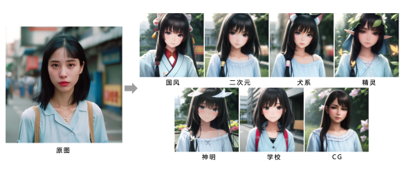 对于用户来说,使用该功能的最大优势就是可以根据自己的需求进行定制化处理。用户只需要上传一张需要处理的图片,系统就会自动进行AI头像生成处理,而且在生成虚拟AI头像后,系统还会匹配相同风格的背景元素,让图片整体看起来更加自然和美观;同时,该功能还支持多种效果和风格的随机切换,用户可以根据自己的需求选择适合的风格,比如国风、校园风、精灵风等,使图片处理过程更加个性化和智能化。