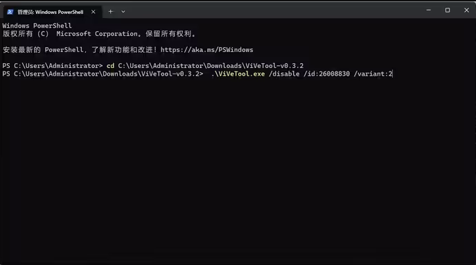 4、再输入 \ViVeTool.exe /disable /id:26008830 /variant:2。