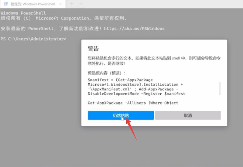 3、粘贴的时候系统可能会弹出下方的弹窗,点击“仍要粘贴”,再回车执行。