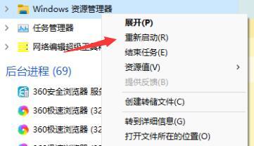 2、然后在其中找到“Windows资源管理器”,右键选中它点击“重新启动”即可。