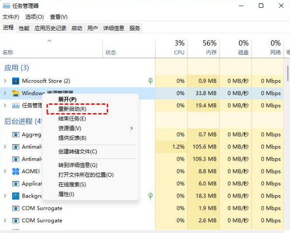 3、然后在进程列表中找到“Windows Explorer”服务。右键单击此服务并选择“重新启动”。