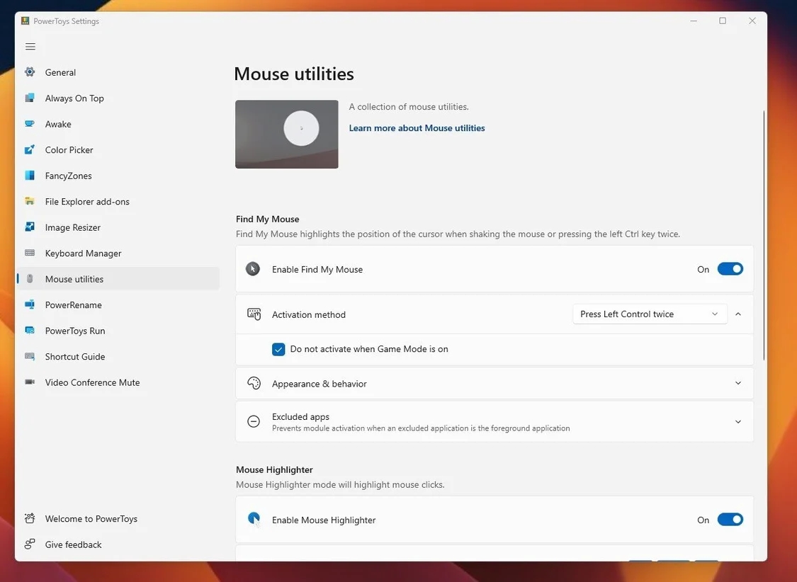 PowerToys 是微软官方出品的 Win10 / Win11 优化工具,为系统提供了一些额外功能。其中一项功能就是“寻找我的鼠标”。在安装 PowerToys 之后,该功能默认启用,手动启用 / 禁用方式如下: