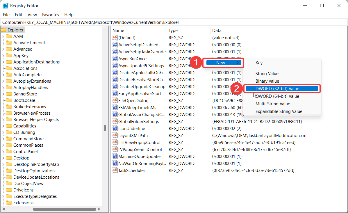 进入文件夹后,右键单击右窗格中的任意位置,然后选择“新建”,然后选择“DWORD(32 位)”值。