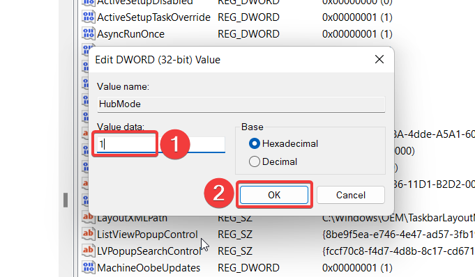 接下来,将新创建的 DWORD(32 位)重命名为 HubMode。