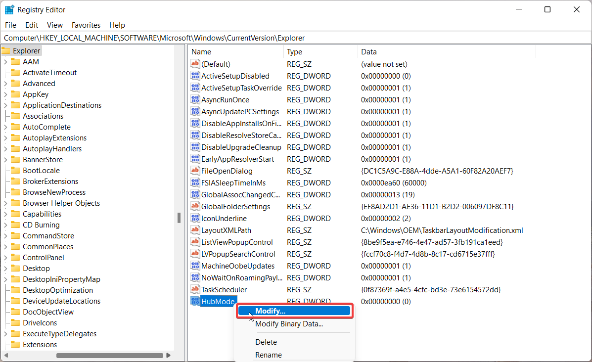 您将在“高级”文件夹中找到条目列表。在注册表的右侧部分中查找 LaunchTo 条目,右键单击它,然后从上下文菜单中选择“修改”。