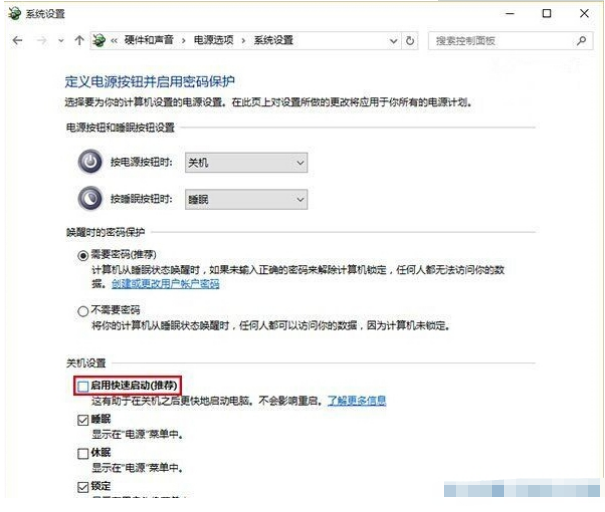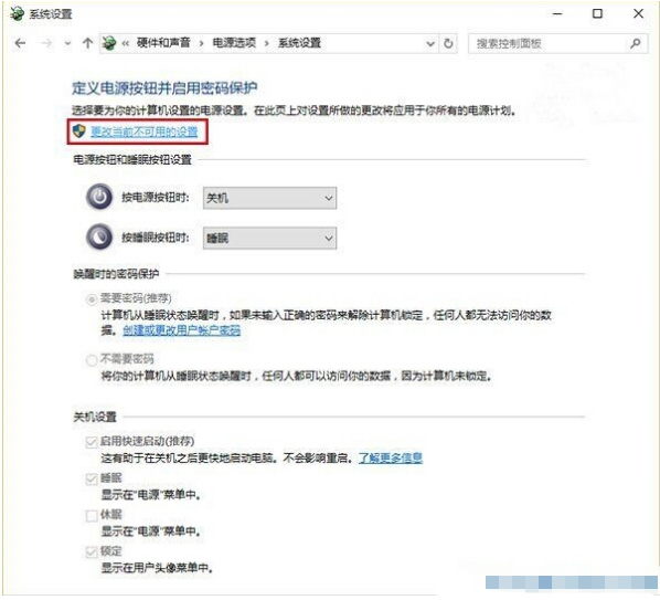 5、其实这时我们现在已经看到了“启用快速启动功能(推荐)”了,不过会发现为灰色不可进行点击,我们要先点上方的“更改当前不可用的设置”。