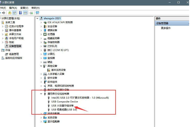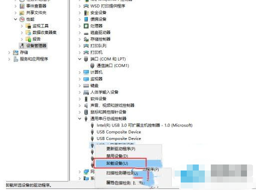 4、找到USB大容量存储设备,点击【右键】,在打开的菜单项中,选择【卸载设备】,完成后,再将U盘拔出,重新插入。