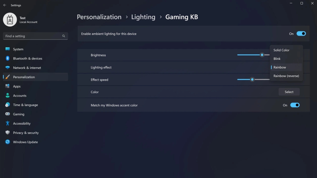 在原生支持方面,另一个即将消除对第三方应用需求(在一定程度上)的变化是新增 RGB 灯光控制。微软正在开发一个专门的设置部分,用于管理带有背光和 RGB 灯光的配件,例如键盘、鼠标等。Windows 动态照明将允许用户从设置应用中自定义 RGB 灯光,而不需要使用第三方开发者的程序。微软表示,Windows 动态照明将于本月向用户、开发者和硬件合作伙伴推出测试版。