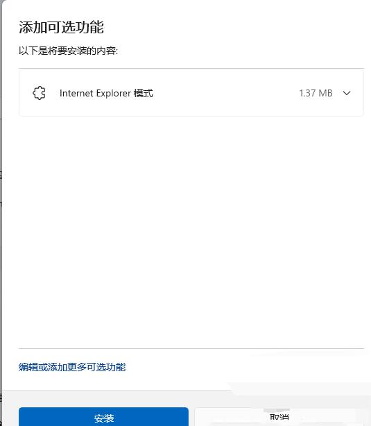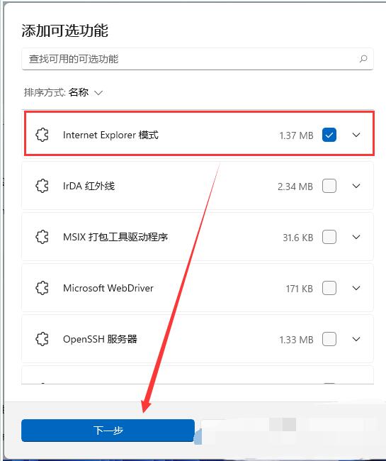 5、添加可选功能,找到并勾选Internet Explorer 模式,然后点击下一步。