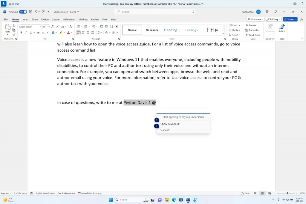 当你开启拼写命令后,系统自会弹出拼写窗口,您可以在其中听写字母、数字、符号、注音等,而且系统还会向你提供建议(类似输入法的候选项),你可以说“单击 [数字]”以选择建议(如果有),而且系统也会自动积累拼写经验,当你下一次再听写这个单词、短语、文本时会自动从 Windows 词典中呈现建议。