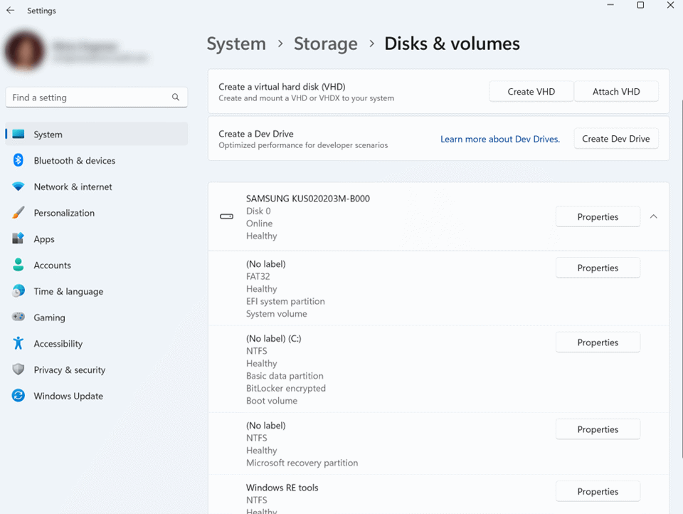 要设置 Dev Drive,您可以在现有驱动器的可用空间中创建一个或另外新建一个 VHD / VHDX,你可以通过“系统”>“存储”>“高级存储设置”>“磁盘和卷”下的“设置”或通过命令行完成。