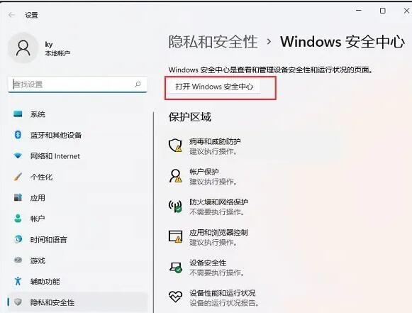 2、当前路径为:隐私和安全性 → Windows 安全中心,点击打开 Windows 安全中心。