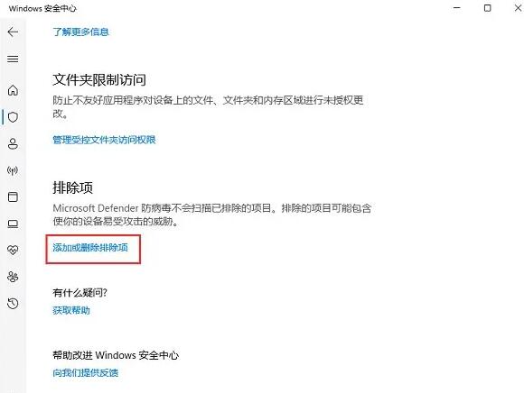 5、排除项(Microsoft Defender 防病毒不会扫描已排除的项目。排除的项目可能包含使你的设备易受攻击的威胁)下,点击添加或删除排除项。