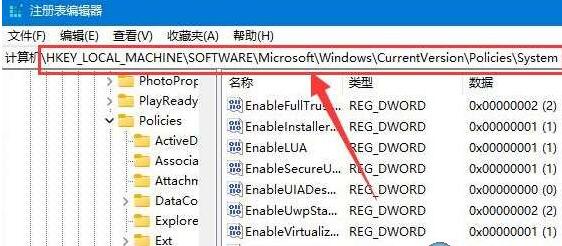 2、接着,在打开的界面中,依次点击展开“HKEY_LOCAL_MACHINE\SOFTWARE\Microsoft\Windows\CurrentVersion\Policies\System”。