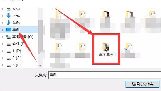 5、找到“桌面美图”文件夹后,单击选择,切记不是双击点进去,而是单击选择。对话框右下角,会出现“选择此文件夹”,单击即可。