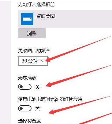 6、设置好后,回到“个性化”设置窗口,下面有四个“属性”设置,可以根据自己的喜好,对桌面图片的“更换频率、顺序、电源、契合度”等进行设置。