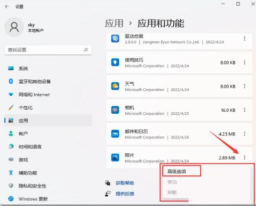 4、当前路径为:应用》应用和功能,找到并点击照片最右侧的【几个小点】,在打开的选项中,再点击【高级选项】。