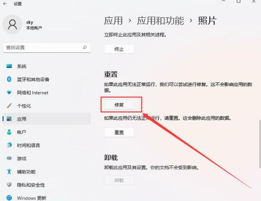 5、往下,找到并点击【修复(如果此应用无法正常运行,我们可以尝试进行修复。这不会影响应用的数据。)】。