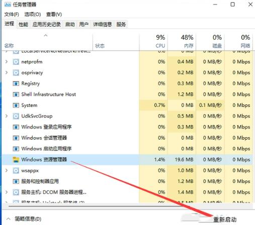 3、任务管理器窗口,选择【Windows 资源管理器进程】,点击右下角的【重新启动】,即可重启Windows 资源管理器,这其实是Windows 资源管理器进程explorer.exe结束后,又重新启动的过程;
